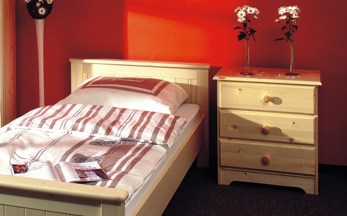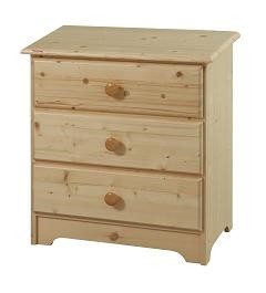 Klasická dřevěná komoda se třemi zásuvkami vhodná do ložnice i dětského pokoje.