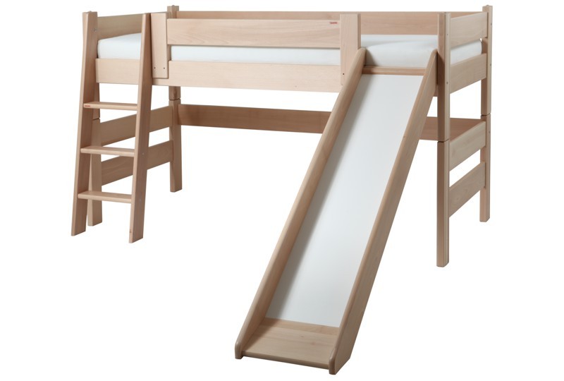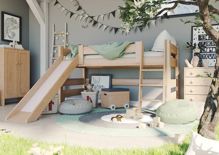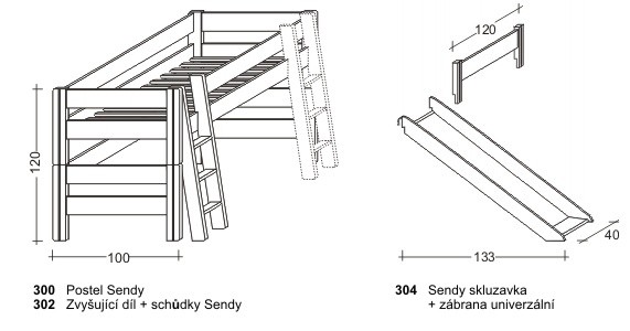Patrová postel z masivu Sendy je složena ze samostatné postele Sendy a zvyšujícího dílu se schůdky, zde je doplněna skluzavkou a zábranou