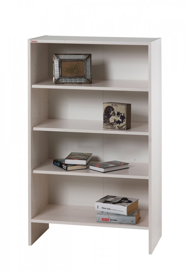 Bílá komoda z masivu otevřená se třemi policemi.