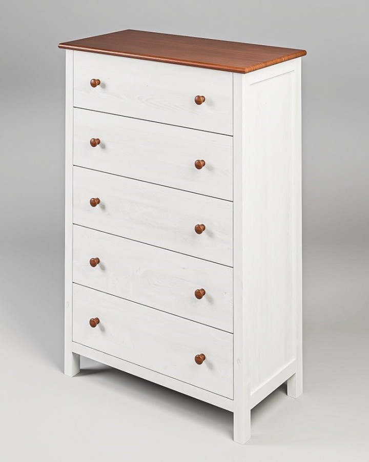 Řada nábytku Anny v bílo-hnědém provedení je vhodná do vaší ložnice, ale také k vybavení chaty či chalupy. Záda komody - bílý sololak.