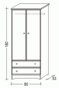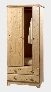 2-křídlá dřevěná šatní skříň s prostorem na ramínka a dvěmi zásuvkami přes celou šířku skříně.