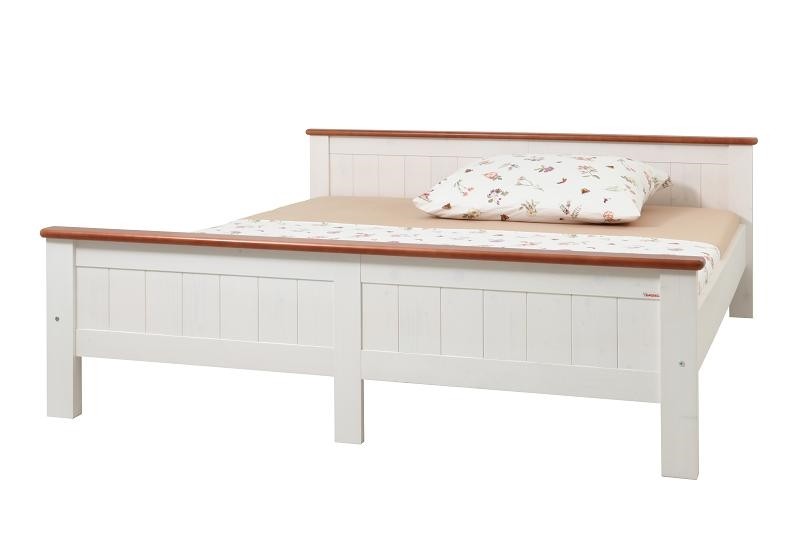 Klasická dřevěná postel s vyššími čely v bílo-hnědém retro provedení.